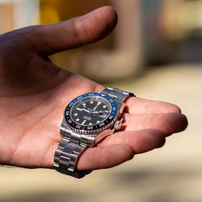 - Arabic numerals on the Swiss Super-Luminova night vision bezel.