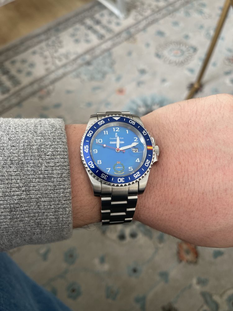 En definitiva, en buen producto por el precio y un cliente contento con su reloj.estuvieras dentro del mar en un día soleado, además tiene el escudo de la escuadrilla de submarinos de la Armada a todo color.