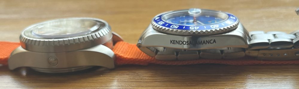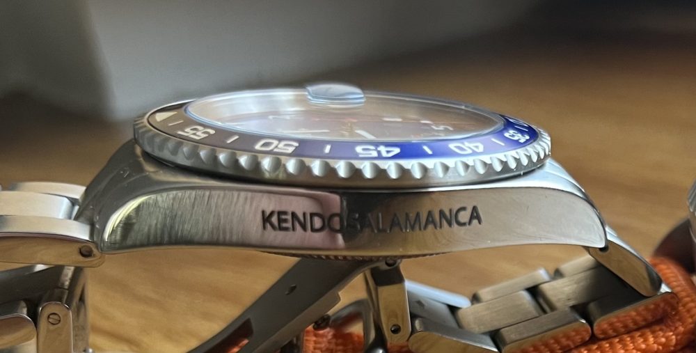El bisel de aluminio con el detalle de la bandera es más estrecho de lo hababitual para realzar el dial, me hubiera gustado más cerámico .