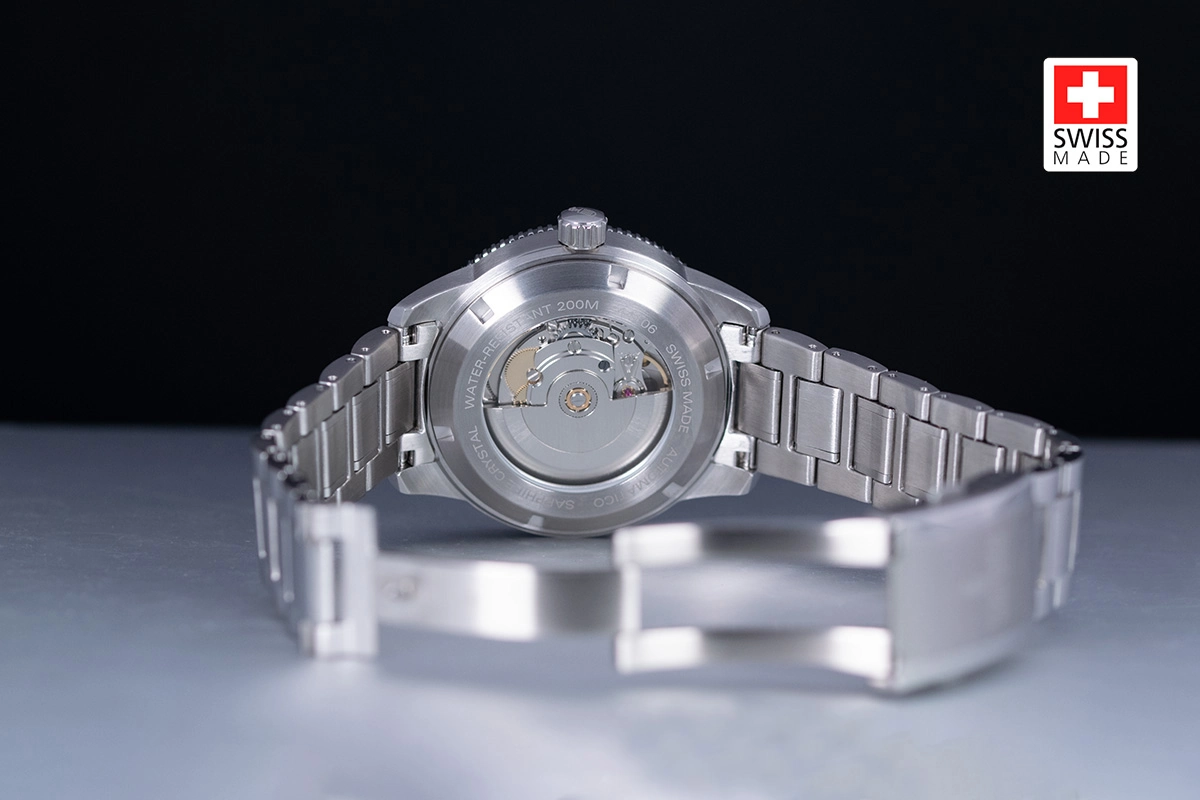 Equipado con el calibre SW-200-1 Swiss Made, el ABYSS 200 funciona sin pilas, impulsado únicamente por el movimiento natural de tu muñeca. Un mecanismo robusto, preciso y contrastado durante décadas, visible a través de su fondo transparente. Ingeniería suiza pensada para durar, mantener el pulso del tiempo y acompañarte con fiabilidad, incluso cuando el entorno exige lo máximo.