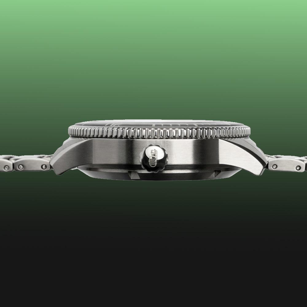 La caja de acero del ABYSS 200 ofrece una presencia firme y equilibrada en la muñeca, combinando robustez y comodidad. Cada elemento está pensado para soportar el uso intensivo, proteger el movimiento y mantener su carácter con el paso del tiempo. Una construcción honesta, sin artificios, donde cada milímetro cumple una función clara.