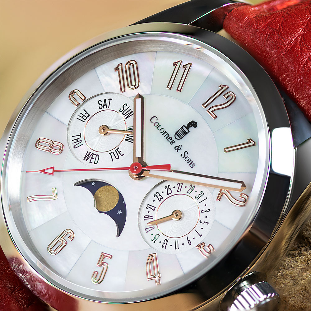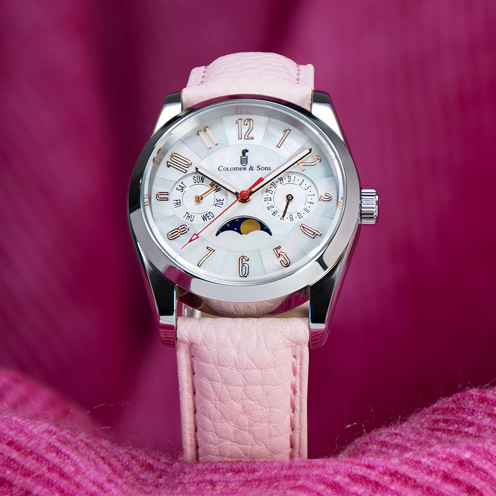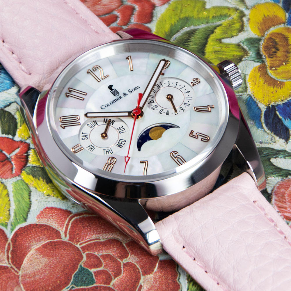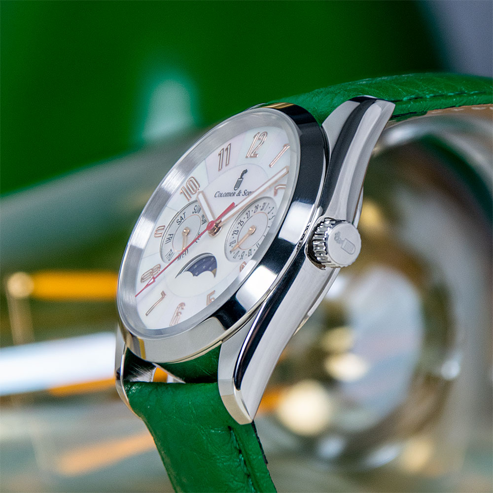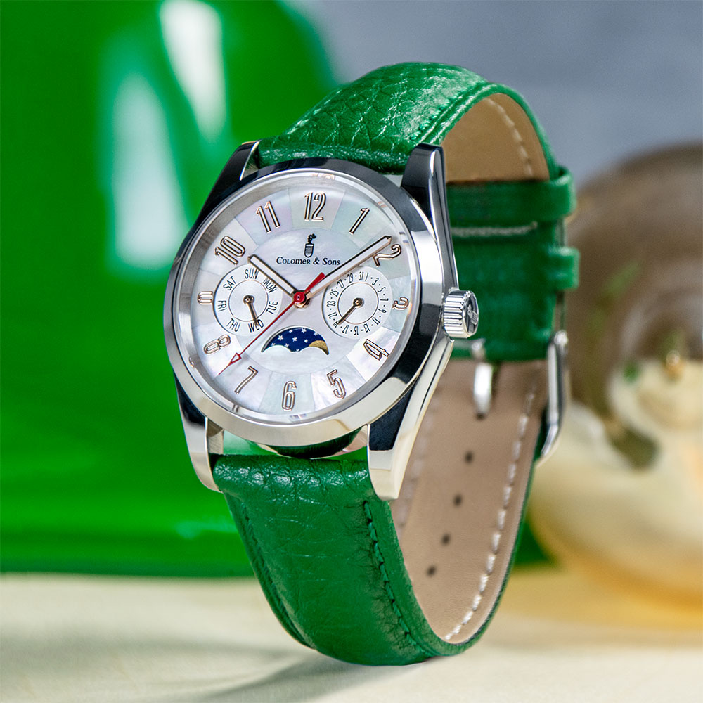 El diseño de esta joya destaca especialmente por su espectacular dial madre perla, que según la incidencia de la luz te mostrará diferentes tonos verdes y morados. Un diseño muy elegante para ella y que no dejará indiferente a quien lo observe. Además del indicador de día del mes, el Clotilde Lunar trae consigo complicaciones relojeras como el indicador del día de la semana y el indicador de la fase lunar.