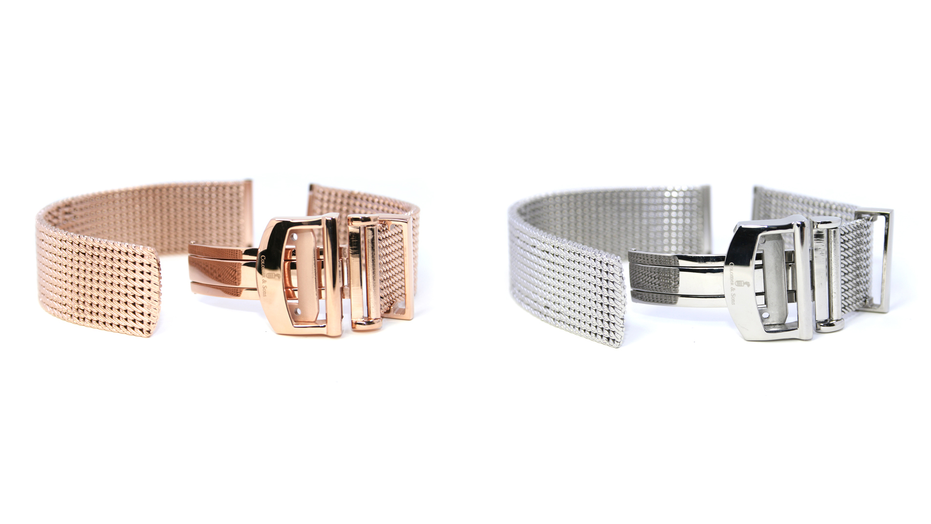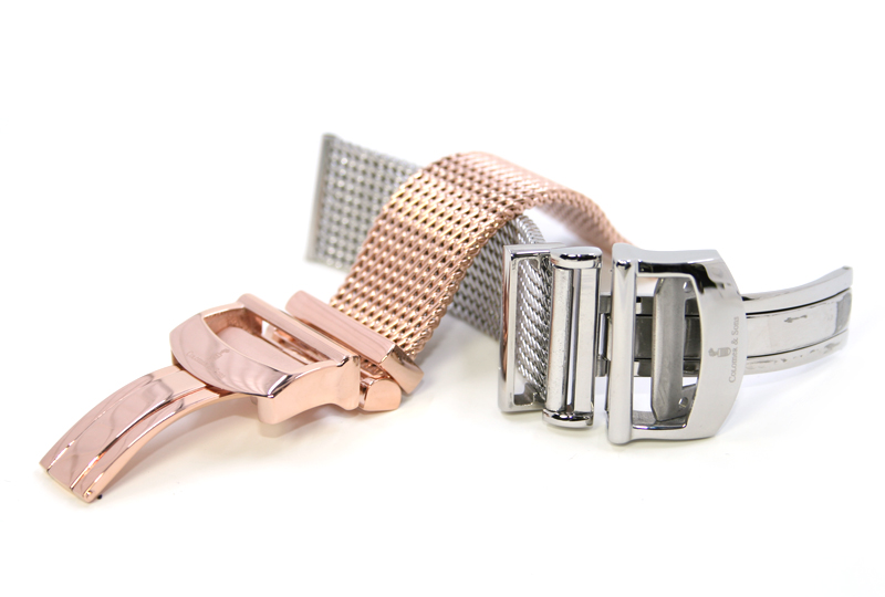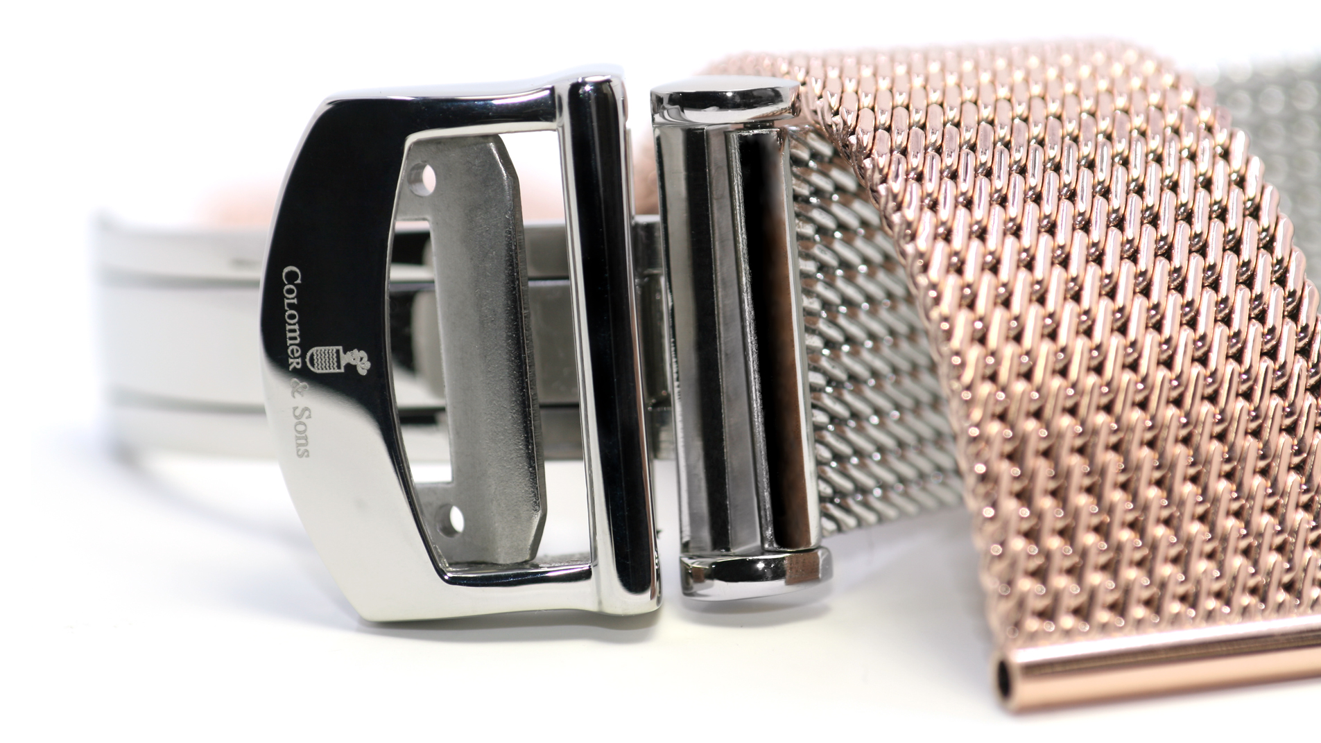 Correa de metal, acero inoxidable 316L antialérgico con logo grabado de Colomer & Sons en el cierre de seguridad.