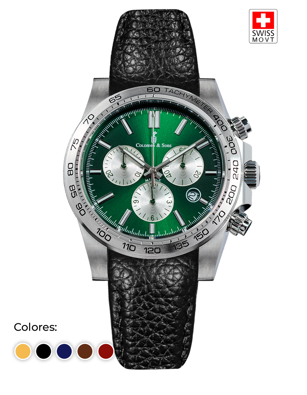Sumérgete en la elegancia del tiempo con nuestro cronógrafo marino. Su diseño cautivador se inspira en las aguas profundas del océano, reflejando la belleza y misterio del mar. Las esferas verdes imitan la profundidad de las aguas cristalinas, mientras que los detalles en acero inoxidable evocan la fortaleza de las olas. Un reloj que te conecta con la naturaleza.