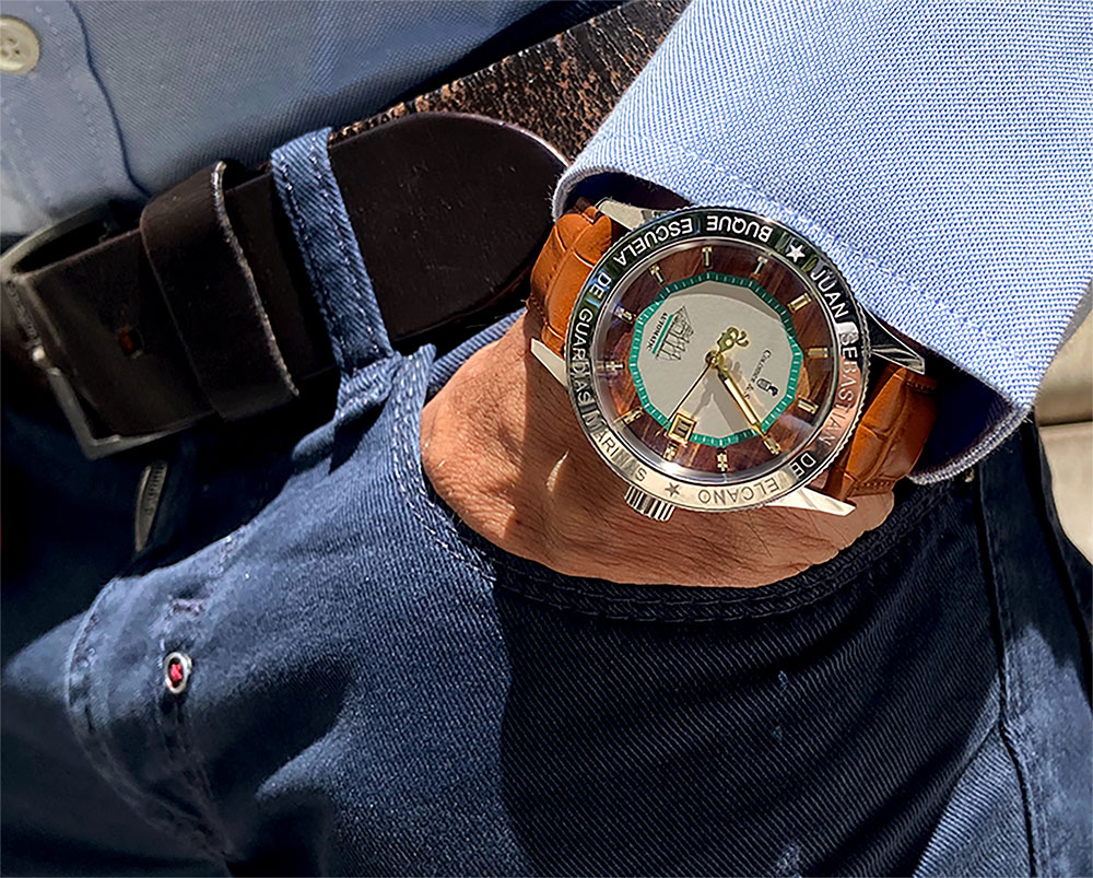 Embárcate en un viaje donde el diseño se encuentra con la historia a través del reloj Juan Sebastián Elcano. Este exquisito guardatiempos encarna la fusión perfecta entre tradición y modernidad, presentando una caja de acero inoxidable 316L adornada con un anillo de madera que evoca la robustez y elegancia del barco que le da nombre. Su esfera engalanada con madera está protegida por un robusto cristal de zafiro doble curva, antirreflejo y antirayaduras. El Juan Sebastián Elcano es más que un reloj; es una pieza de historia en tu muñeca.