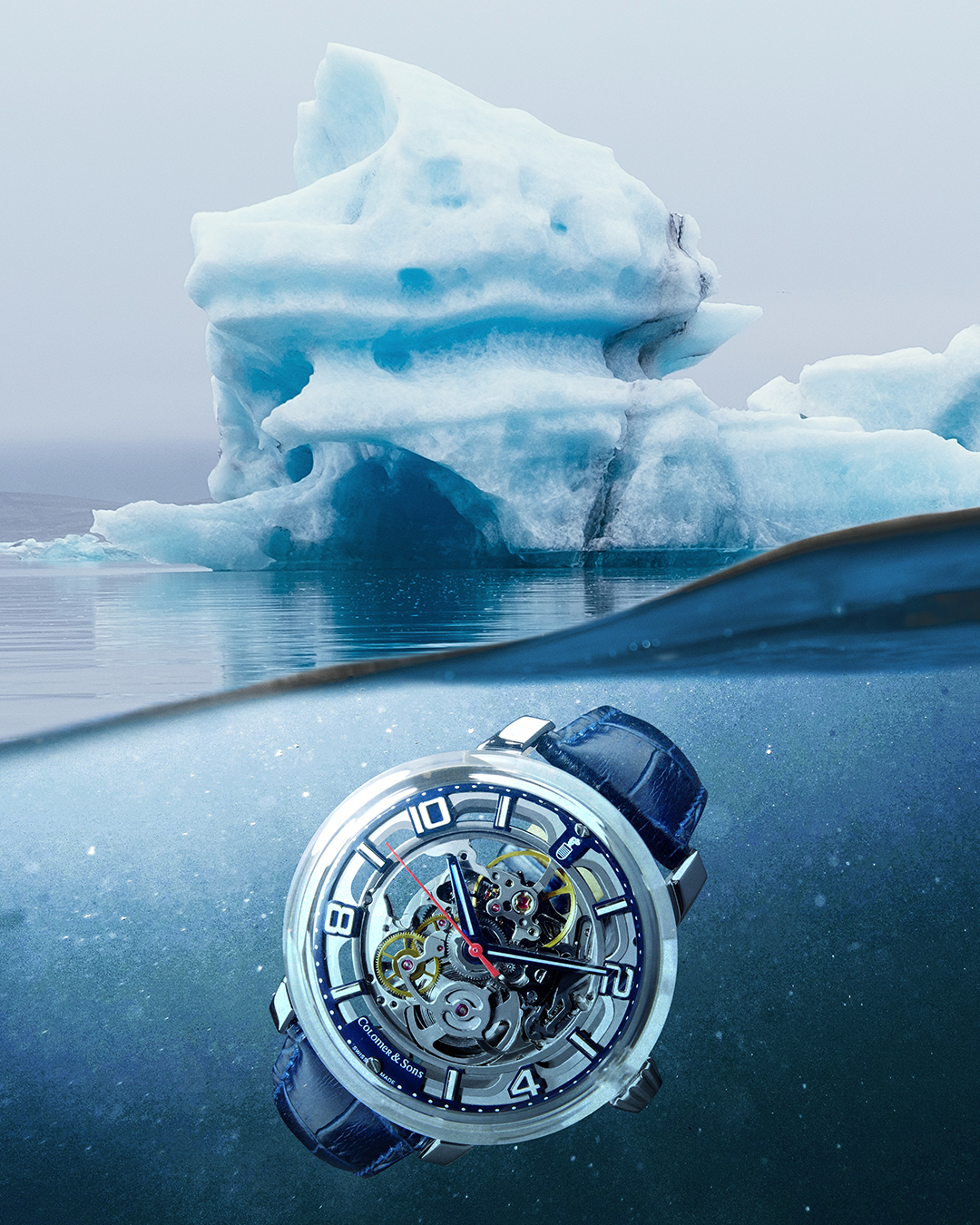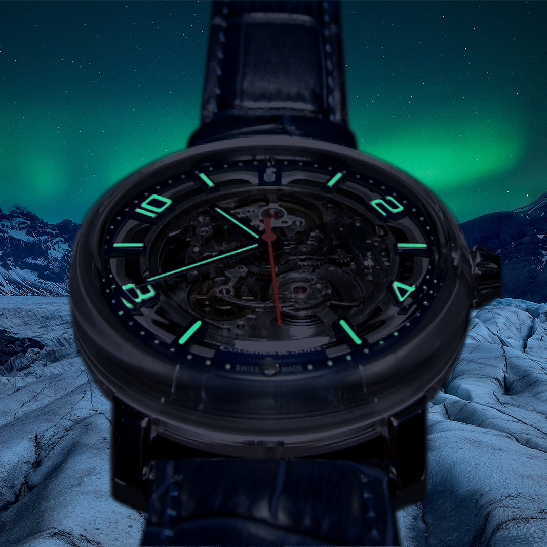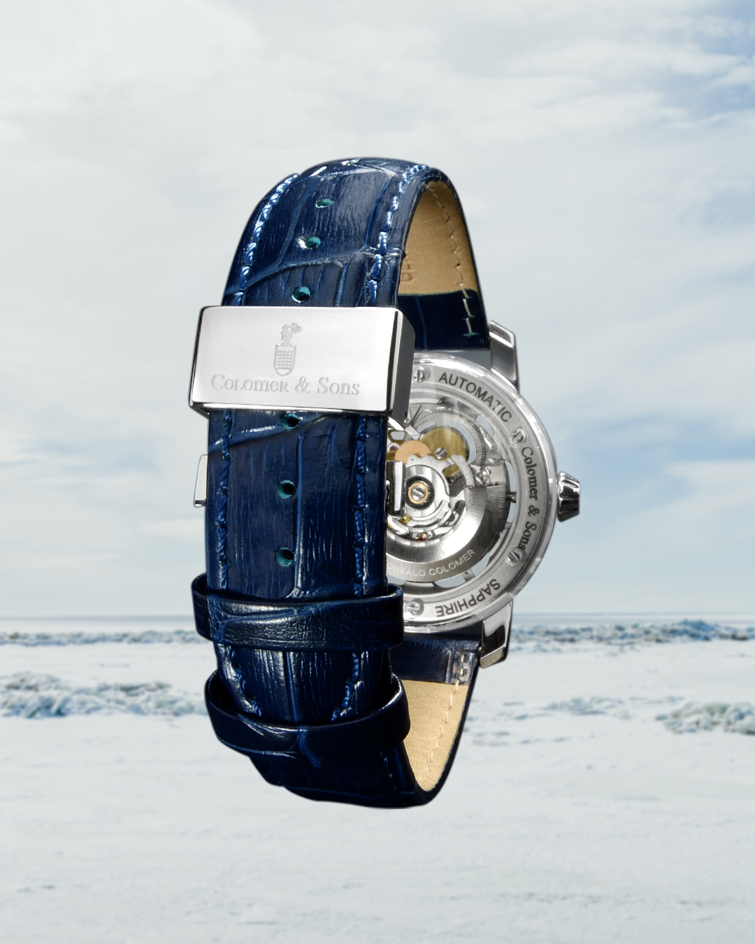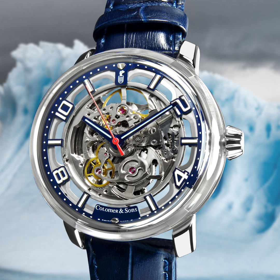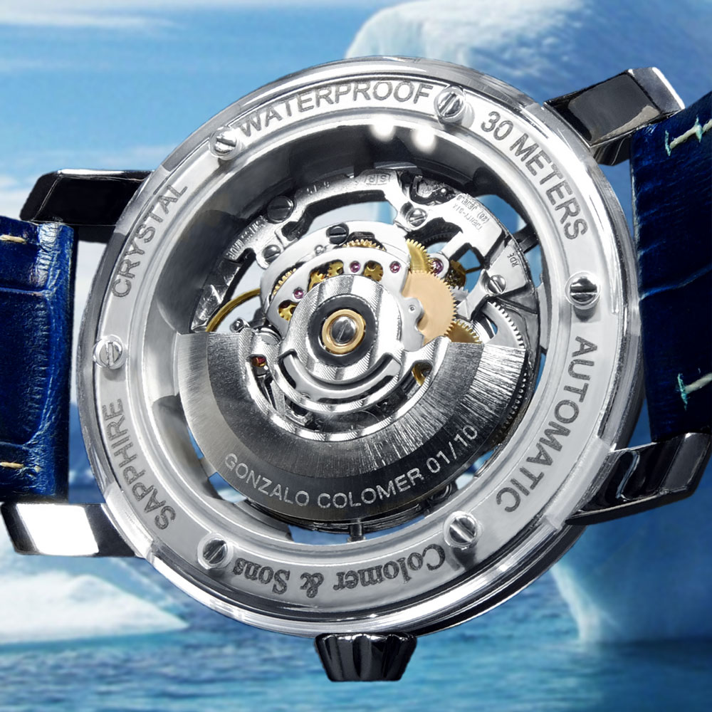 Un fascinante reloj con caja completamente de cristal de zafiro y movimiento suizo skeleton. Inspirado en el misterioso continente de hielo, el reloj Antarctica es un gran desafío por descubrir.