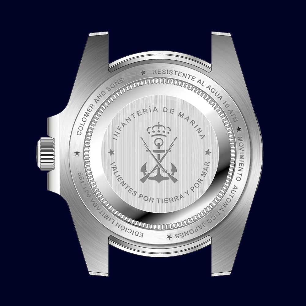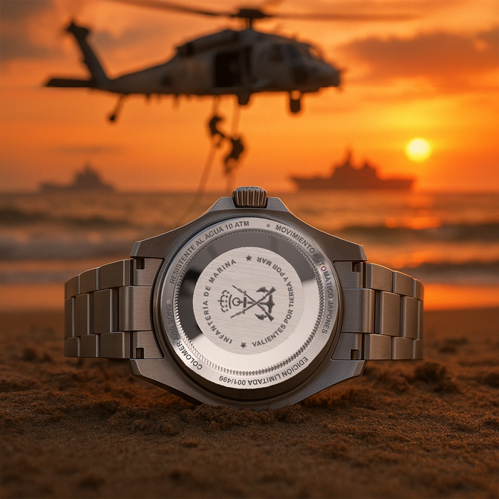 Este reloj rinde homenaje a la Infantería de Marina Española, el cuerpo más antiguo del mundo. Cada detalle refleja su espíritu: honor, valor y compromiso con el cuerpo de Infantería. Una pieza automática de acero, creada en Edición limitada, para quienes sienten orgullo de pertenecer y llevar su historia en la muñeca.
