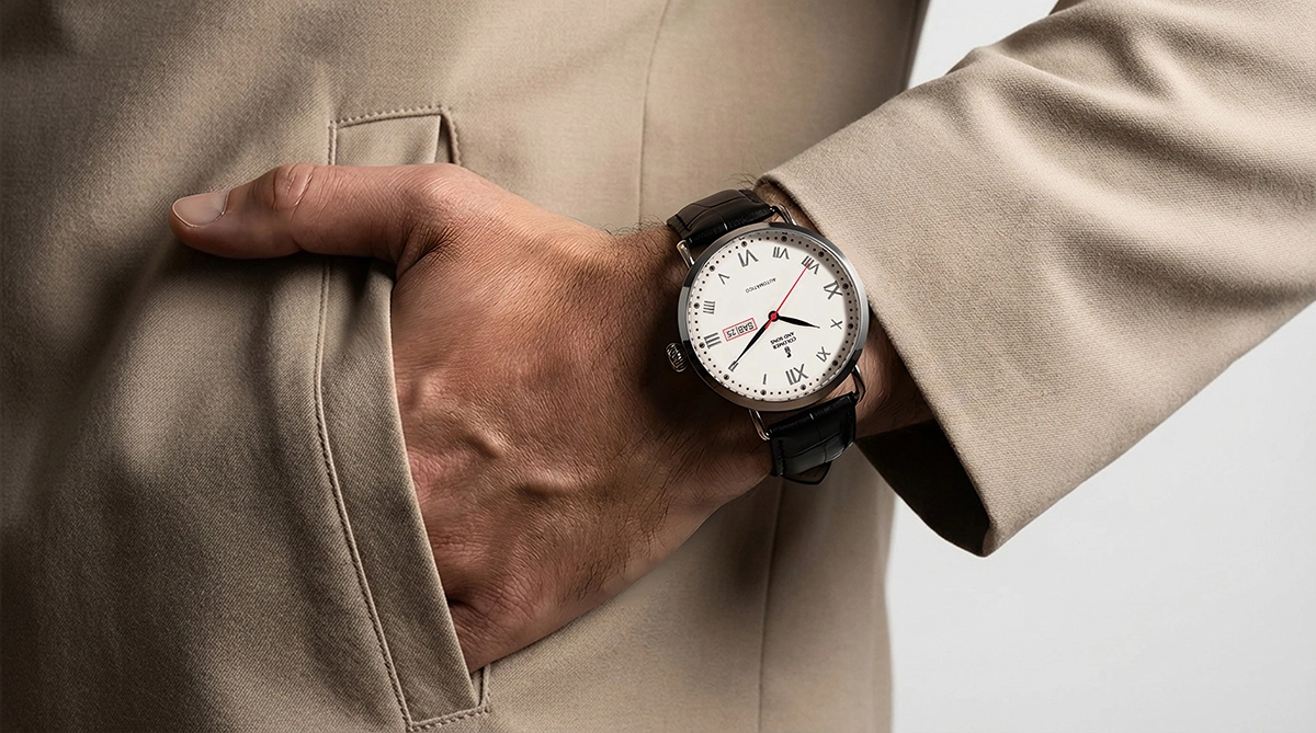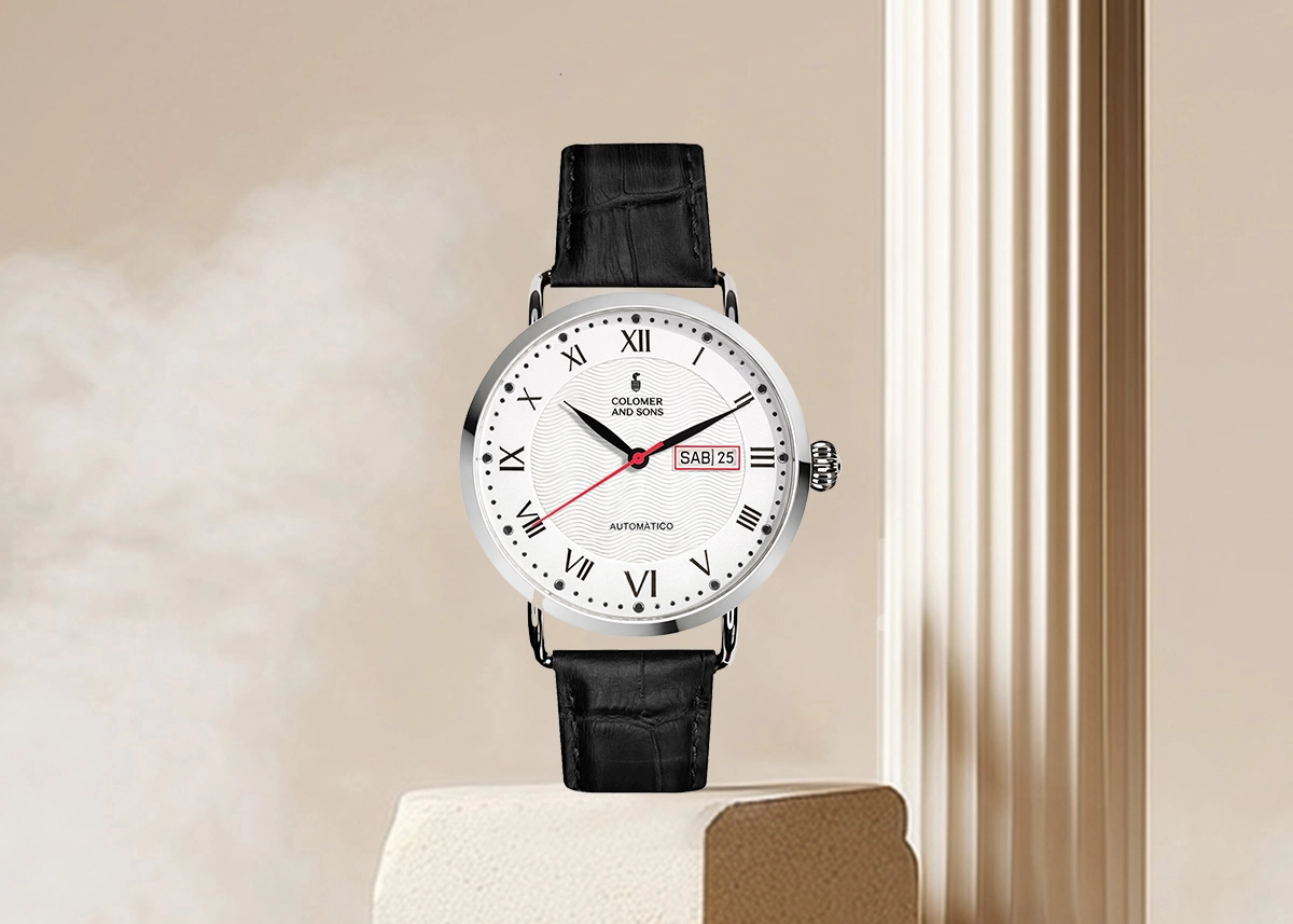 Textura, proporción y carácter. El dial de Roma Tempus presenta una superficie ondulada que recuerda al fluir del río Tíber y al arte de los mosaicos antiguos. La numeración romana aporta equilibrio visual y una sensación de solemnidad serena. Las agujas negras contrastan con el fondo claro para una legibilidad perfecta, acompañadas de un segundero rojo que introduce un pequeño latido visual. Así mismo su calendario con el día de la semana y el día del mes te ofrecerán la información que necesitas.