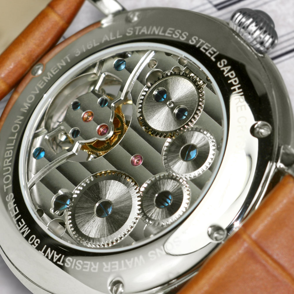 Su caja de acero inoxidable no solo asegura durabilidad, sino que también protege su movimiento con un toque de sofisticación atemporal a tu muñeca. El cristal de zafiro, resistente a arañazos, protege la esfera exquisitamente diseñada, permitiéndote apreciar cada detalle con claridad y sin distorsiones. Además, la correa de cuero, suave y elegante, se adapta cómodamente a tu muñeca, complementando a la perfección el aspecto general de esta obra maestra de la relojería. Este reloj tourbillon no solo marca el tiempo, sino que también redefinirá tu estilo, destacando tu buen gusto y apreciación por la artesanía de alta calidad.