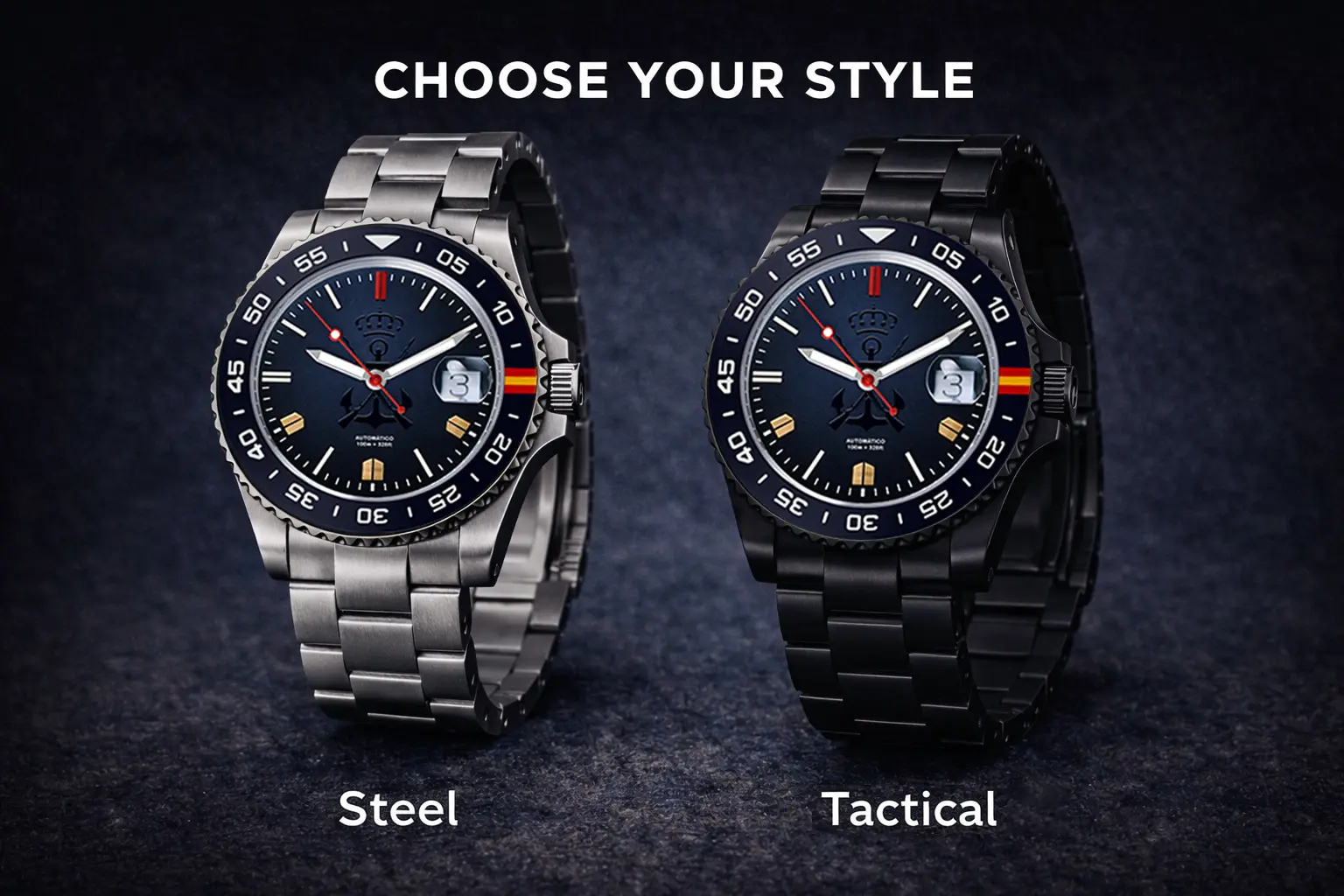 La Edición STEEL ofrece un carácter naval clásico con su acabado en acero inoxidable, mientras que la Edición TACTICAL presenta una discreta caja y brazalete de PVD negro inspirados en el equipamiento operativo moderno.