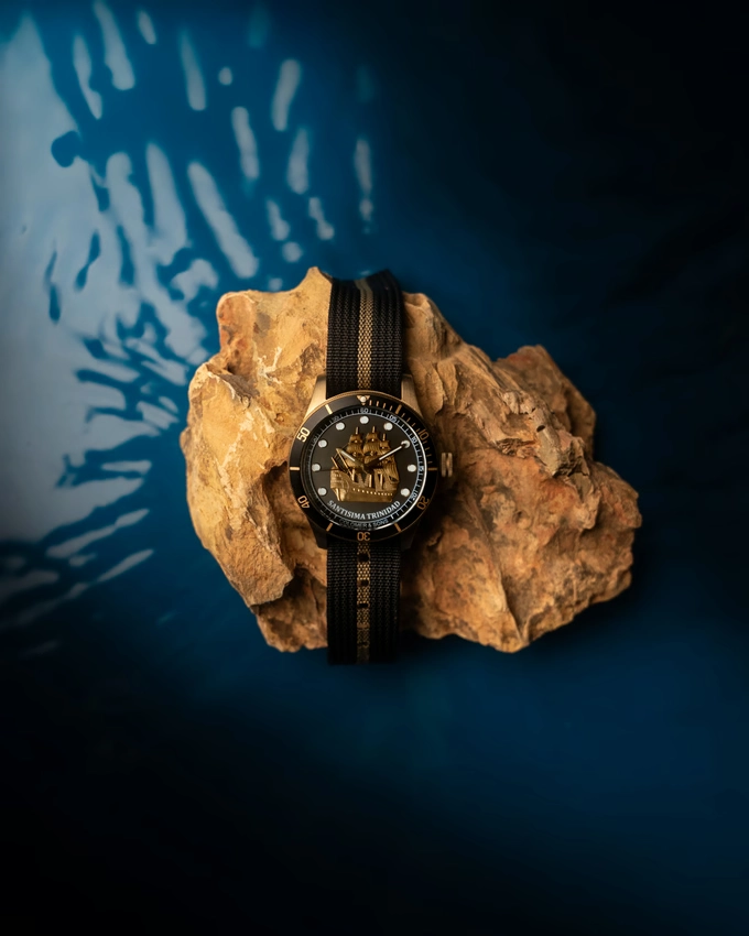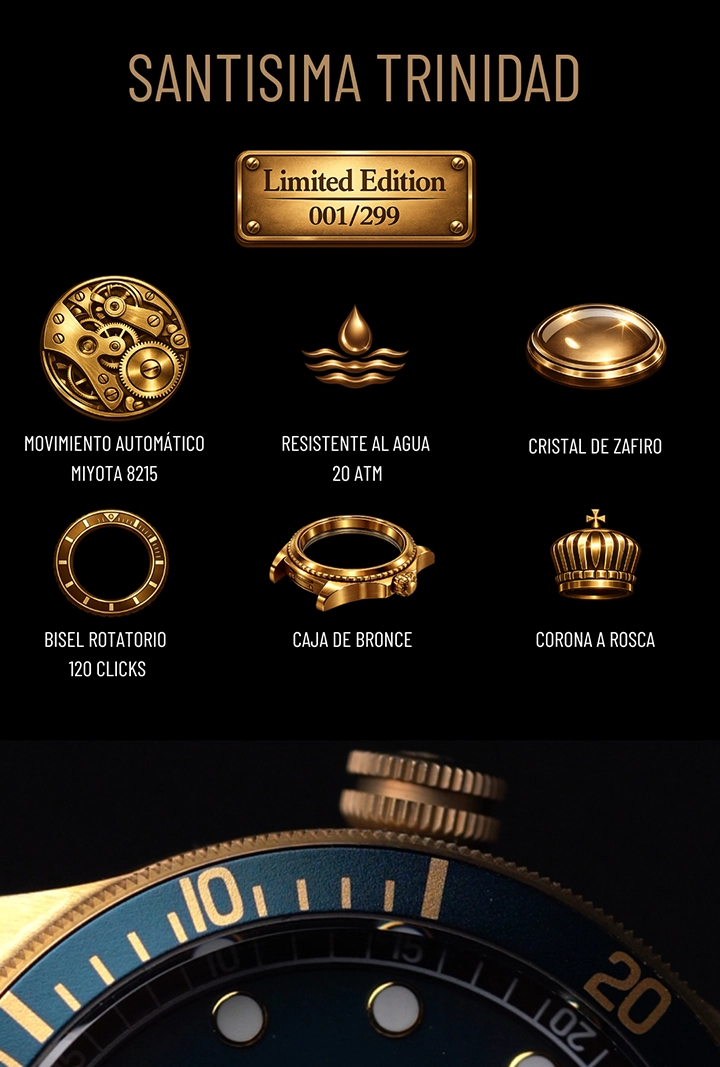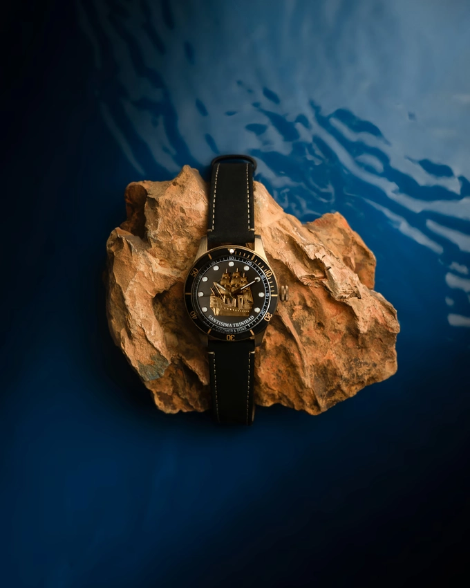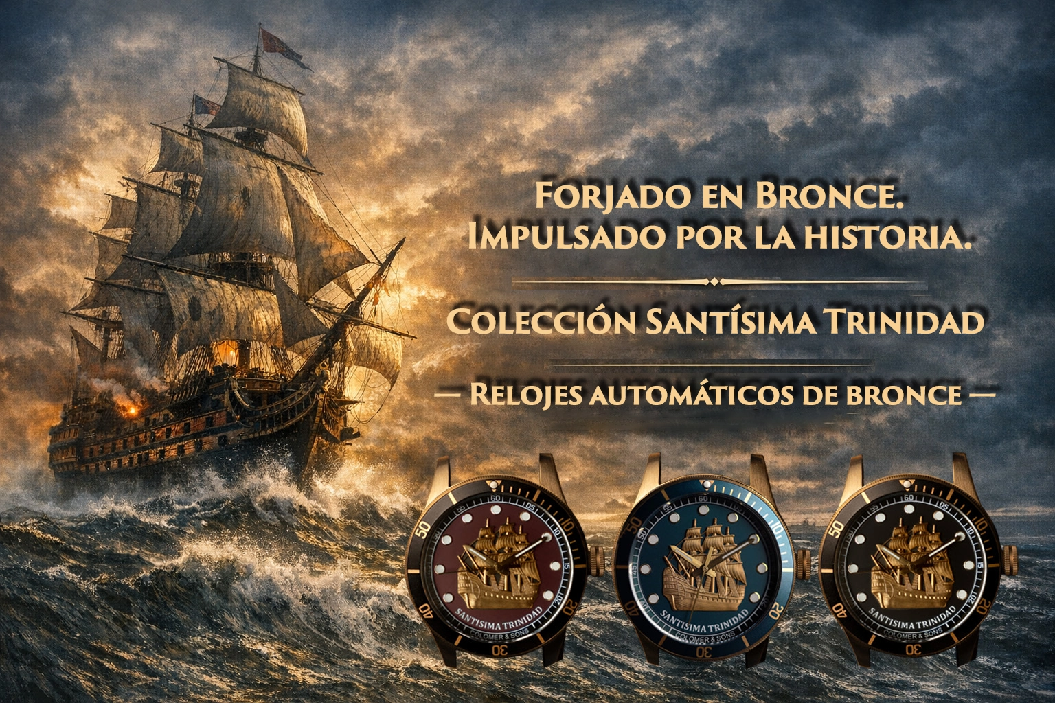 Un gran reloj no se define solo por su diseño, sino por la combinación de historia, materiales y artesanía. La Colección Santísima Trinidad se construye con la misma filosofía que dio forma al buque de guerra más poderoso de su época: resistencia, precisión y propósito. Una caja de bronce vivo, un cristal de zafiro, un fiable movimiento automático y una esfera esculpida en 3D dan vida al legado del barco. Cada detalle se ha elegido para perdurar, evolucionar y contar una historia marcada por el tiempo y el mar.